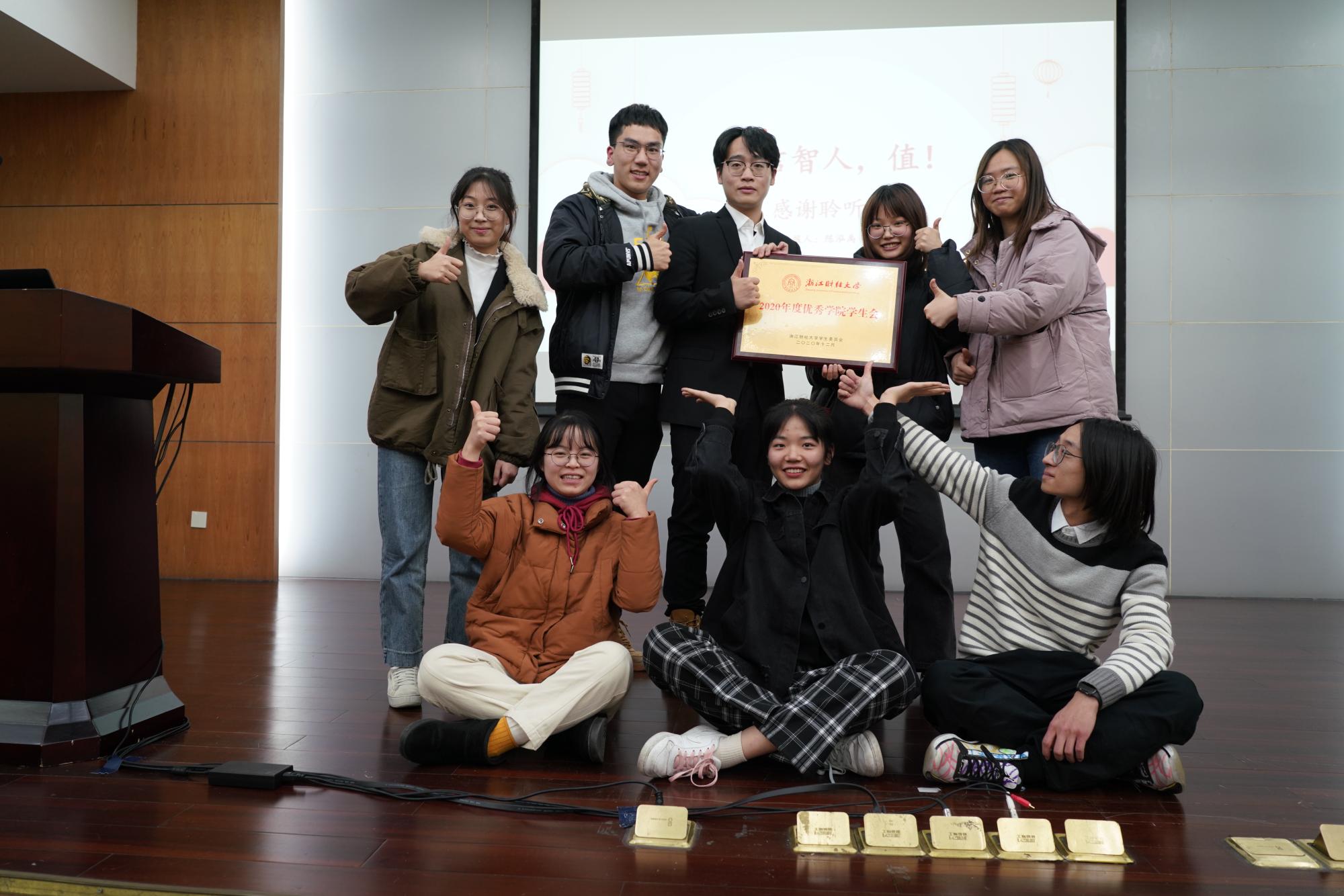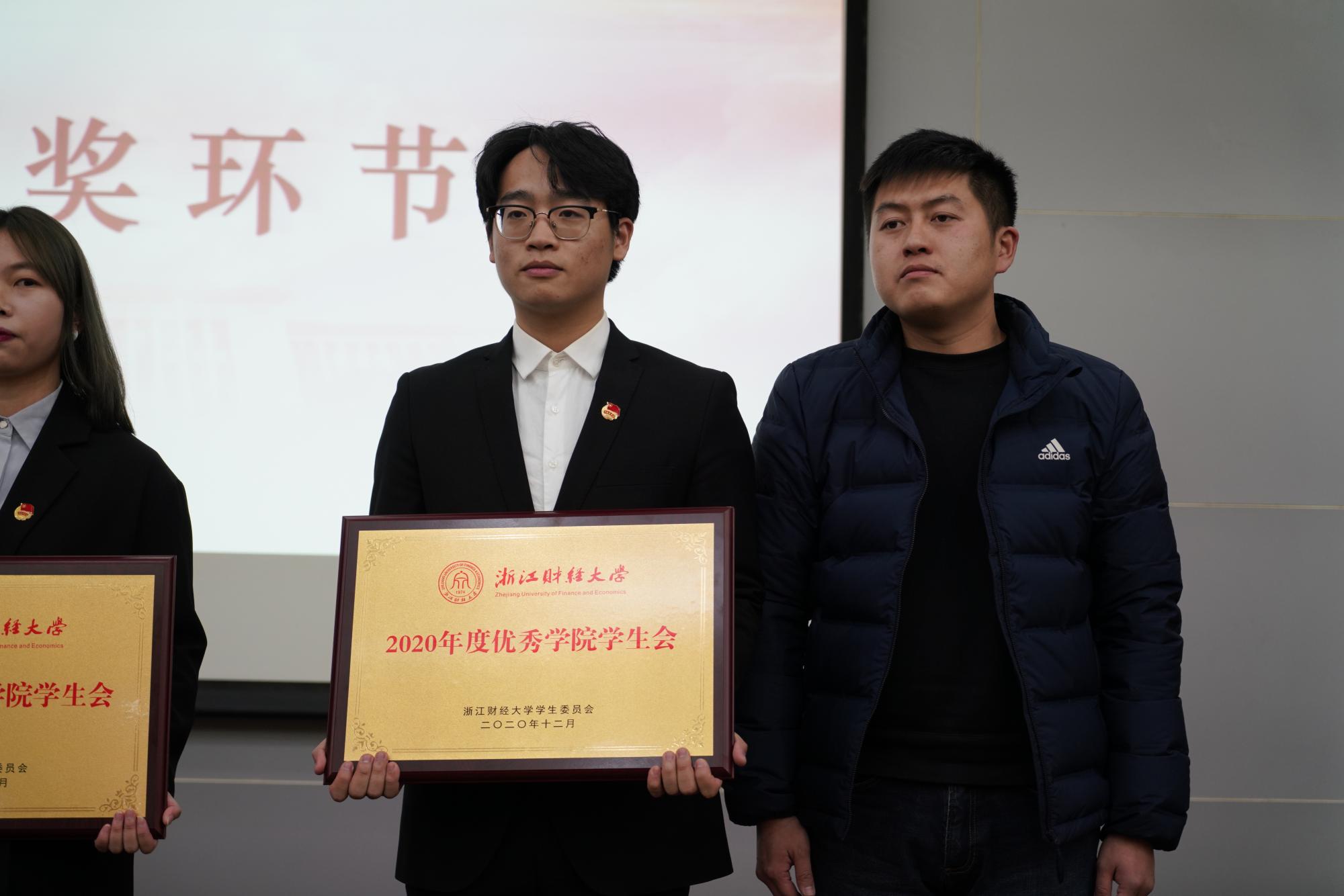 近日,浙江财经大学2020年度学院学生会考核评比会在行政楼二楼报告厅正式举行,校学生处园区主管黄迪、校团委兼职副书记邵巧迷、校团委干事姜远、校学生会主席团及各学院学生代表出席了此次评比会。考评现场,我院学生会执行主席陈泓禹从“优化体制”,“服务极致”,“焕然青志”,“独树一帜”,“学在信智”五个角度对我院学生会2020年度各项工作进行了总结汇报。最终,我院学生会以学生满意度第一、学生会量化考核第三以及现场展示得分第一的优异表现获得在场师生的一致好评,取得综合考评分排名第一的好成绩,荣获2020年度浙江财经大学优秀学院学生会,院学生会执行主席陈泓禹荣获2020年度浙江财经大学优秀学生会干部的荣誉称号。